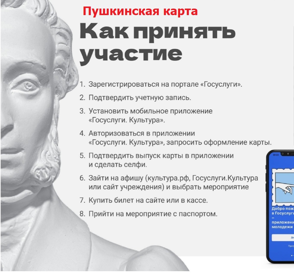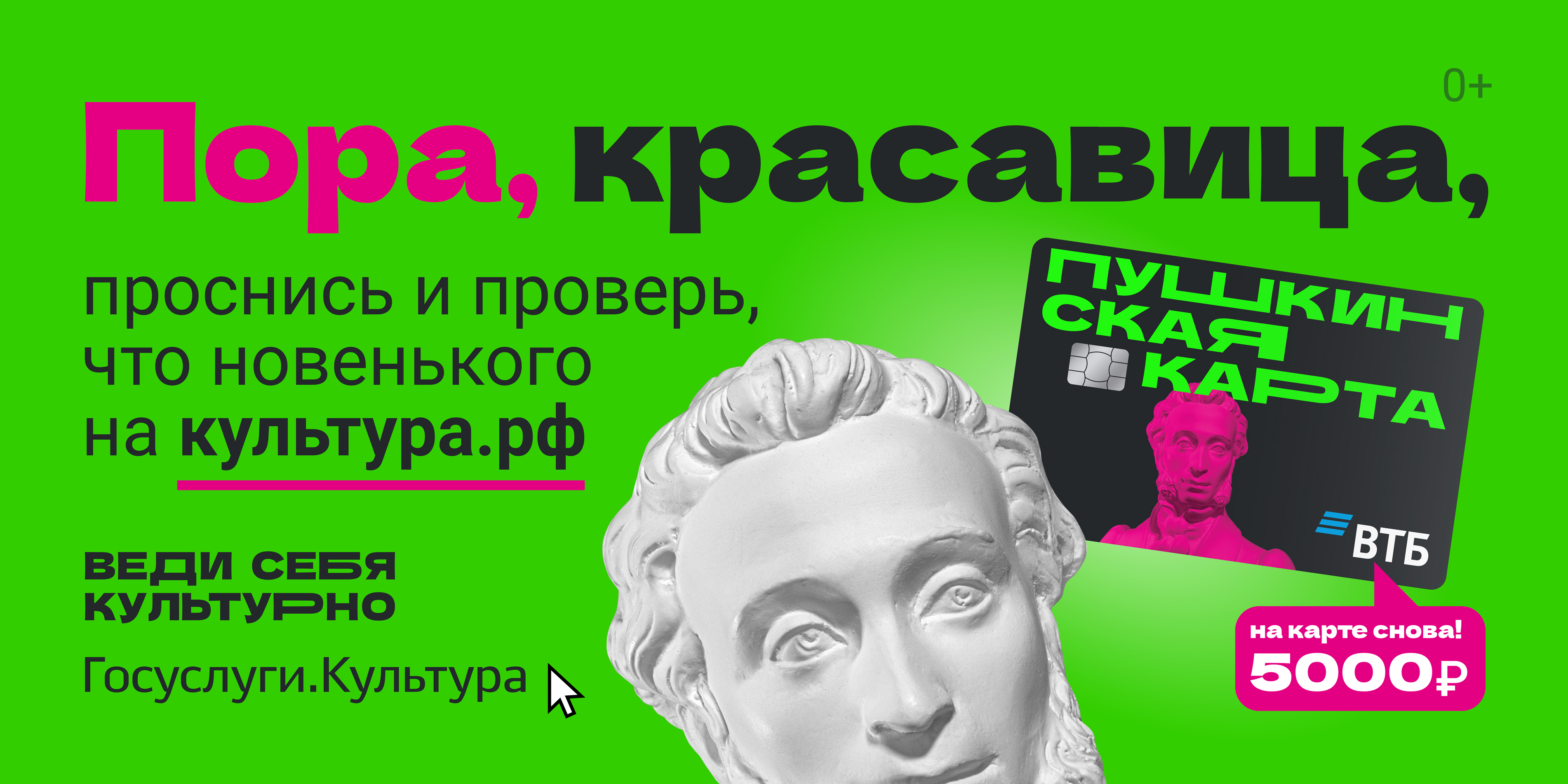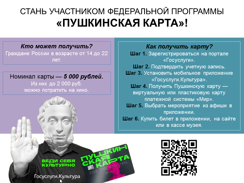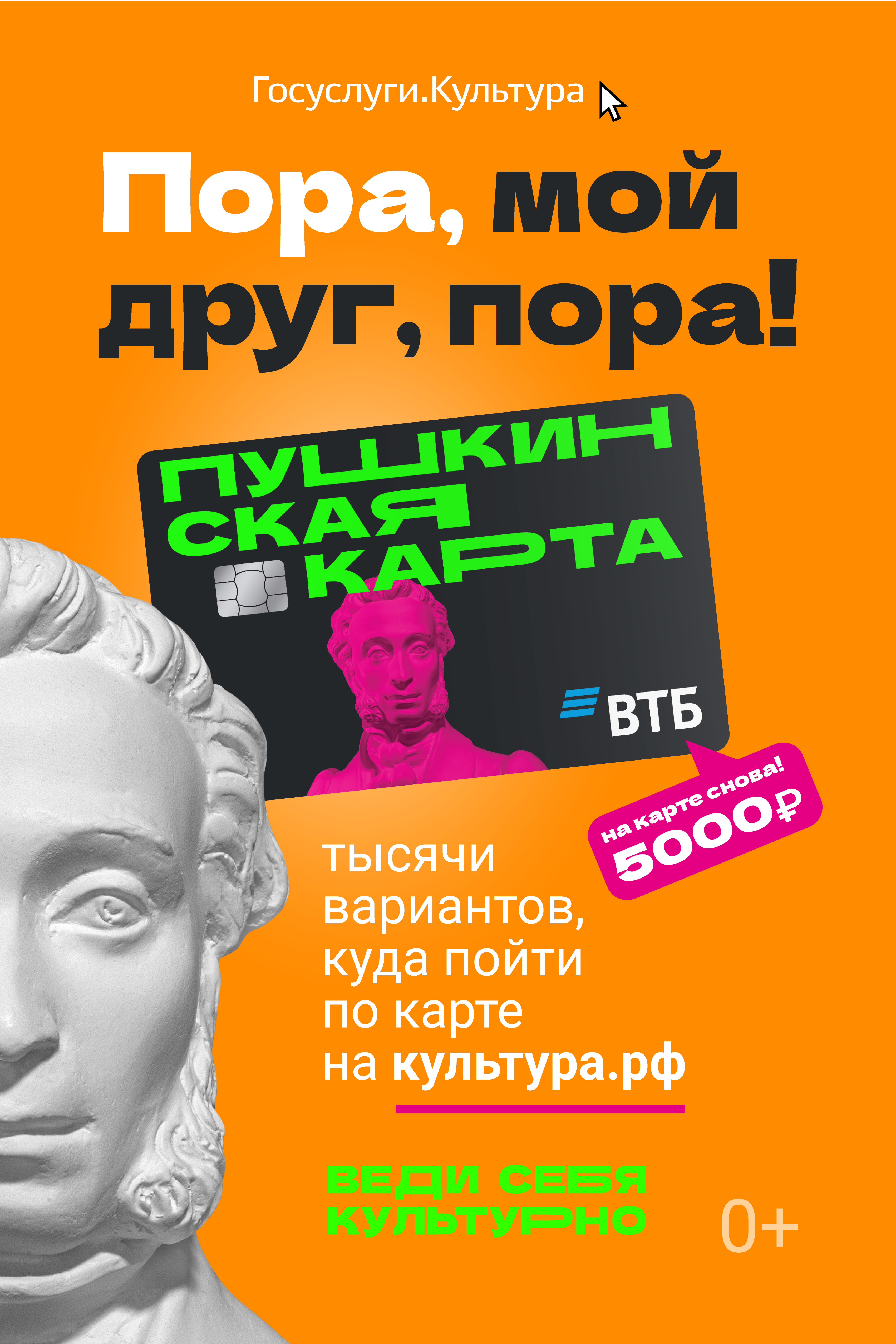 Пушкинская карта — специальная именная карта для оплаты культурных мероприятий: театров, музеев, выставок, концертов, кино и других событий, участвующих в программе. Её могут оформить граждане России в возрасте от 14 до 22 лет включительно.